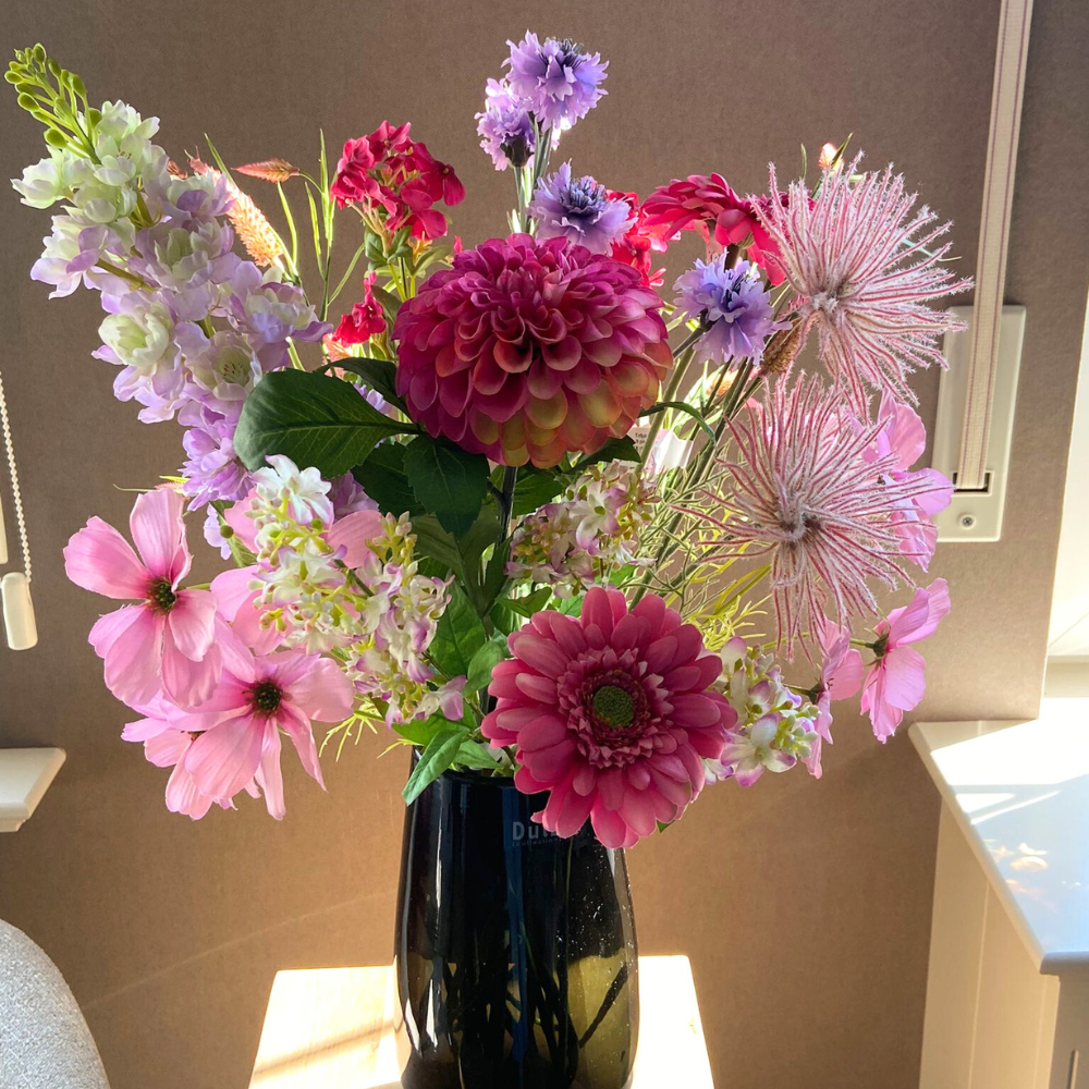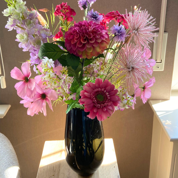 Ontdek onze charmante zijden bloemenstukken in fel en licht roze tinten, een perfecte toevoeging aan elke kamer. Breng je graag een persoonlijke toets aan je zijden bloemen? Personaliseer dan met deze prachtige groene DUTZ vaas.